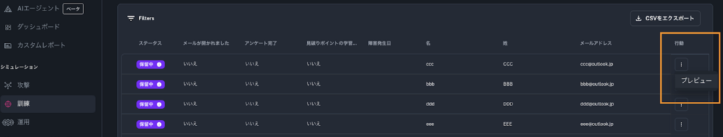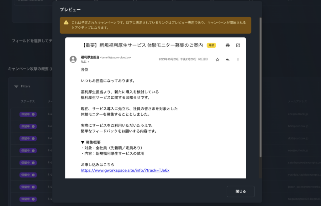 配信予約済みの訓練メールをプレビュー可能に Release Note 2026/01/18 Share リリース日:2026年1月18日 配信予約済みの訓練メールをプレビュー可能になりました。 以前は、配信予約済みの訓練キャンペーンをプレビューしようとすると、「利用可能なコンテンツがありません」と表示されていましたが、これを確認できるよう修正しました。予約済みの訓練 > キャンペーン攻撃の概要 > 行動-プレビュー > 確認可能に Share Twitter Facebook LINE