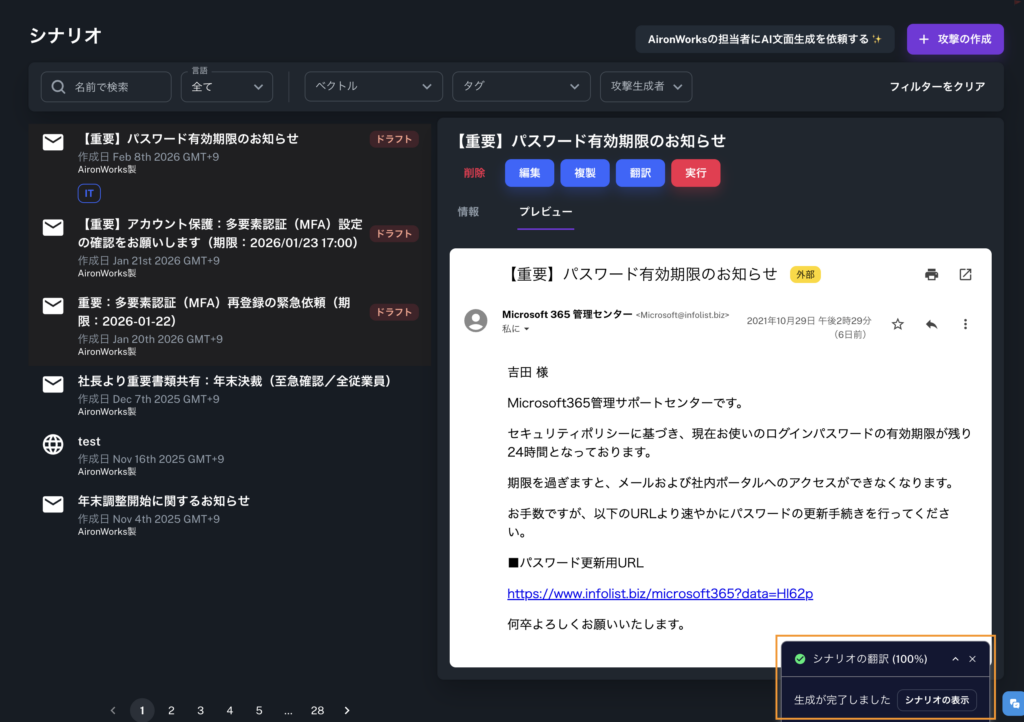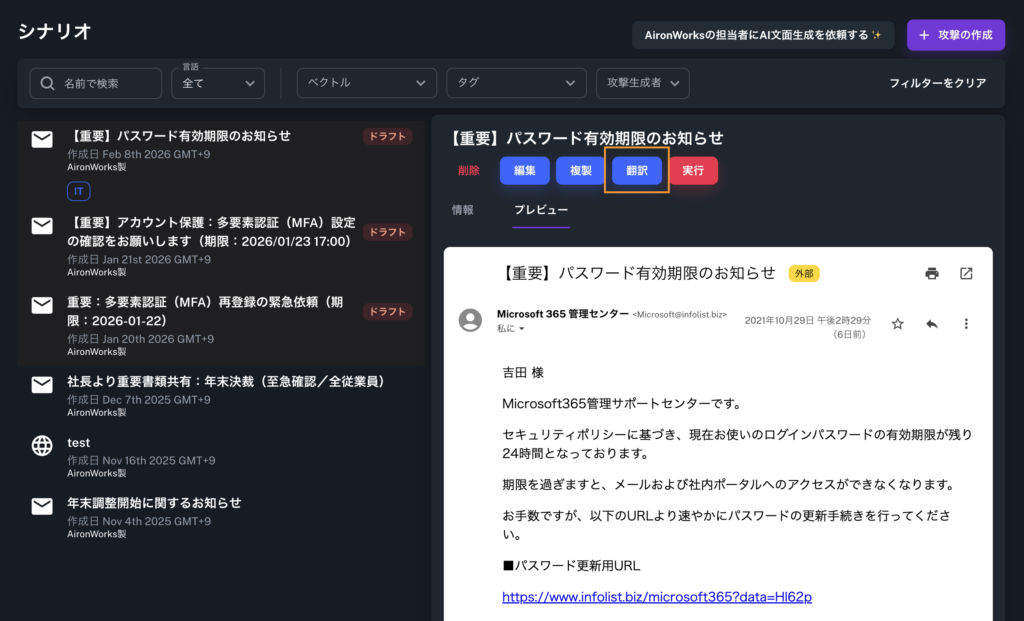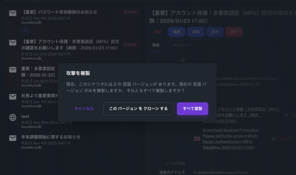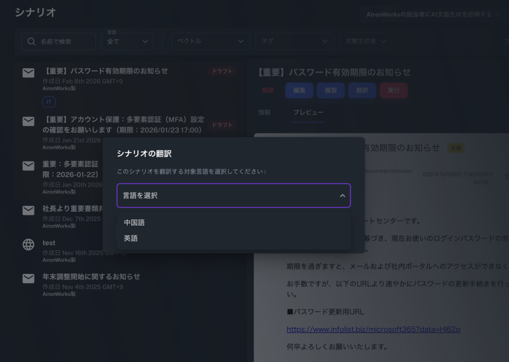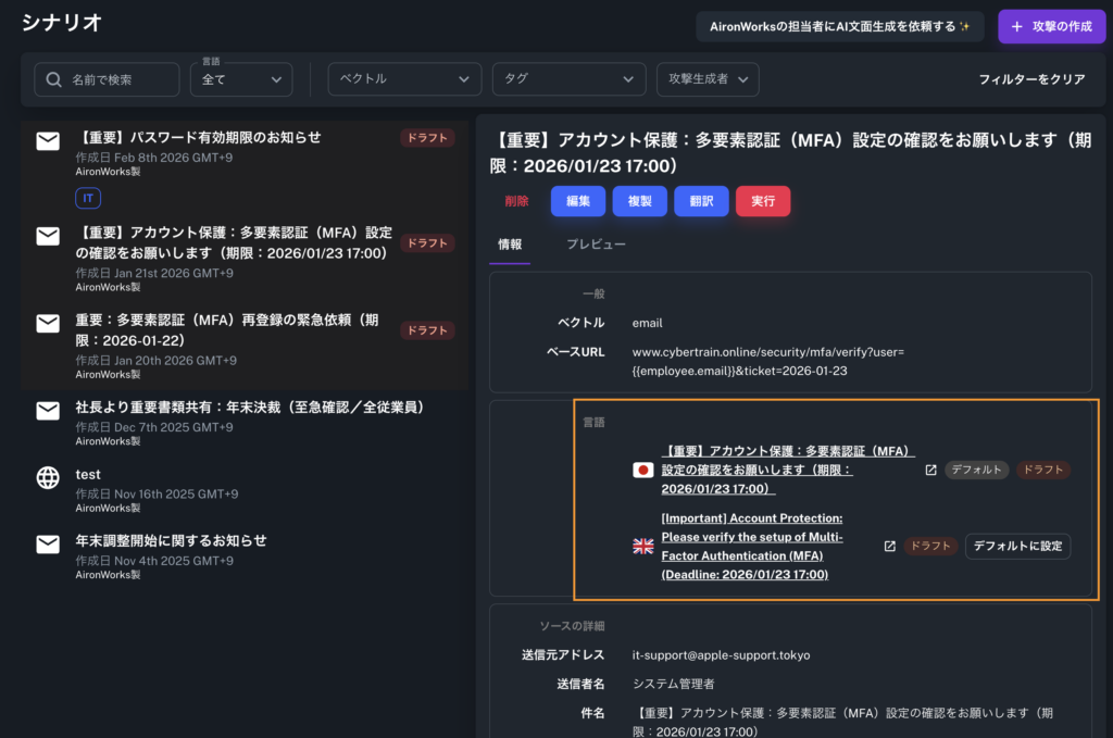 攻撃シナリオ(訓練文面)の多言語管理が可能に